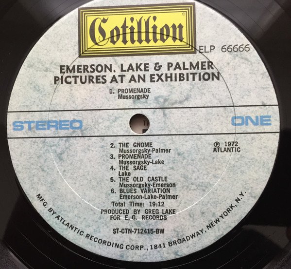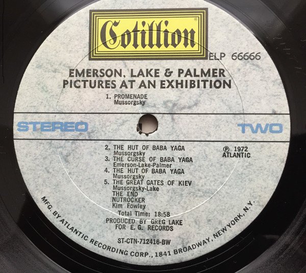 Recorded live, Newcastle City Hall, 26 March 1971. Produced by Greg Lake for E.G. Records© All songs published by TRO-Total Music, Inc., E.G Music, BMI except Nutrocker (Room Seven Music, BMI). ℗ 1972 Atlantic Recording Corporation Printed in USA Atlantic Corporation ROCK 4 inner sleeve (Queens Litho Inc USA) "BW" in label matrix indicates [l303576] pressing