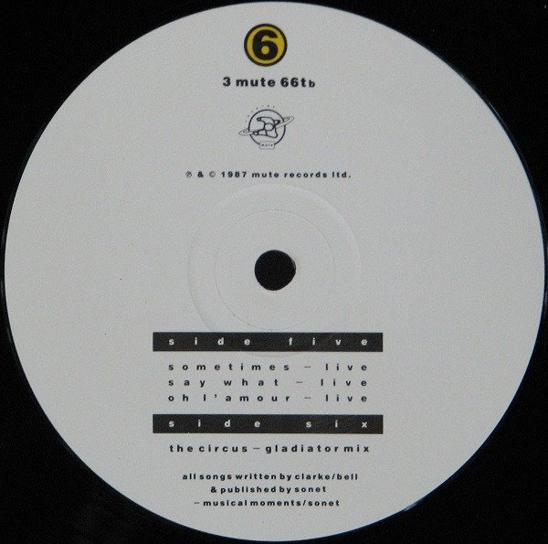 Third in a series of three live 12 inch singles. This 12 inch single represents 1/3 of the Erasure Live In Hamburg series. The collection fits neatly into a special sleeve available only with this third and final 12 inch.Title on the outer special sleeve front: “the live in hamburg collection. the circus tour 1987.” Title on the outer special sleeve spine: “live in hamburg collection.”All live tracks mixed at Trident Studios. Recorded at Knopf Music Halle – Hamburg April 27th/28th 1987 with Ruessl Mobile.Side Six: Remixed at KonkPublished by Sonet - Musical Moments / SonetAdditional information: Full length hi-fi video Erasure "[m=320453]" available from all good record stores.Original versions of all tracks are on the LP, CD and Cassette "[m=5097]" or "[m=4468]".Also included a four page MUTE history/discography (see photos)