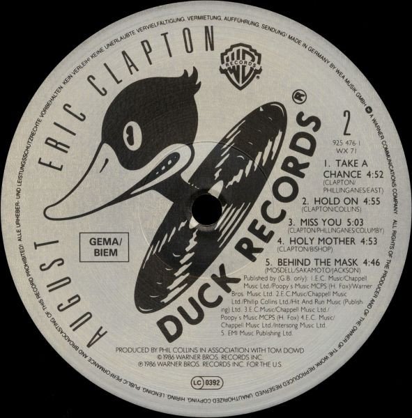℗ 1986 Warner Bros. Records Inc. (label) © 1986 Warner Bros. Records Inc for the US (label) © 1986 Warner Bros. Records Inc for the US and WEA International Inc. for the world outside the U.S. (cover) ℗ 1986 Warner Bros. Records Inc for the US and WEA International Inc. for the world outside the U.S. (cover) Manufactured in Germany There appear to be at least 2 variations of the sticker displayed on the 1st photo. Produced by Phil Collins in association with Tom Dowd Published by (G.B. Only) A1: E.C. Music / Chappell Music Ltd / Copyright Control A2, A6: Warner Bros. Music Ltd A3, B3: E.C. Music / Chappell Music Ltd / Poppy's Music MCPS (H.Fox) A4: Warner Bros. Music Ltd / Bug Music A5: Make Zee Music / Orca Songs B1: E.C. Music / Chappell Music Ltd / Poppy's Music MCPS (H.Fox) / Warner Bros. Music Ltd B2: E.C. Music / Chappell Music Ltd / Philip Collins Ltd / Hit And Run Music (Publishing) Ltd B4: E.C. Music / Chappell Music Ltd / Intersong Music Ltd B5: EMI Music Publishing Ltd Embossed "W" logo [Warner Bros] on rear sleeve The runouts denote four different companies involved in manufacturing of the media: Sterling Sound did the mastering (etched Sterling Sound) SRC did the metalwork / plating (etched SP-GER) R/S Alsdorf did the pressing (stamped R/S Alsdorf matrix) This is identical to that release, except for Alsdorf contracted pressing to Sonopress : [r14316513]
