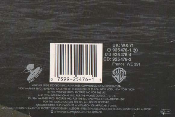 ℗ 1986 Warner Bros. Records Inc. (label) © 1986 Warner Bros. Records Inc for the US (label) © 1986 Warner Bros. Records Inc for the US and WEA International Inc. for the world outside the U.S. (cover) ℗ 1986 Warner Bros. Records Inc for the US and WEA International Inc. for the world outside the U.S. (cover) Manufactured in Germany There appear to be at least 2 variations of the sticker displayed on the 1st photo. Produced by Phil Collins in association with Tom Dowd Published by (G.B. Only) A1: E.C. Music / Chappell Music Ltd / Copyright Control A2, A6: Warner Bros. Music Ltd A3, B3: E.C. Music / Chappell Music Ltd / Poppy's Music MCPS (H.Fox) A4: Warner Bros. Music Ltd / Bug Music A5: Make Zee Music / Orca Songs B1: E.C. Music / Chappell Music Ltd / Poppy's Music MCPS (H.Fox) / Warner Bros. Music Ltd B2: E.C. Music / Chappell Music Ltd / Philip Collins Ltd / Hit And Run Music (Publishing) Ltd B4: E.C. Music / Chappell Music Ltd / Intersong Music Ltd B5: EMI Music Publishing Ltd Embossed "W" logo [Warner Bros] on rear sleeve The runouts denote four different companies involved in manufacturing of the media: Sterling Sound did the mastering (etched Sterling Sound) SRC did the metalwork / plating (etched SP-GER) R/S Alsdorf did the pressing (stamped R/S Alsdorf matrix) This is identical to that release, except for Alsdorf contracted pressing to Sonopress : [r14316513]