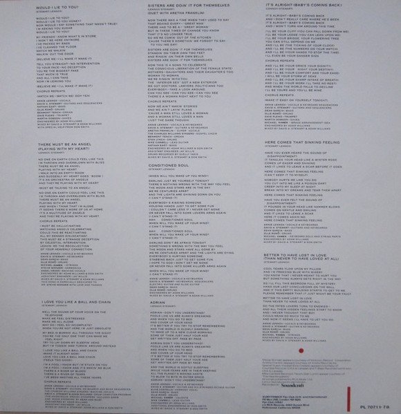Quite similar to two other releases: - This release has the French price code RC 275, while [r=7288793] has a different price code RC 270. - This release has bottom three lines in the insert printed in black and the last line in red, while [r=20802484] has all four lines printed in red. Round removable sticker on sleeve says: Be Yourself Tonight includes Would I Lie To You, There Must Be An Angel (Playing With My Heart), Sisters Are Doin' It For Themselves, It's Alright - (Baby's Coming Back) PL 70711 - This sticker is removable Sleeve © 1985 RCA Ltd. Belgique/België: Distributed by RCA S.A. Deutschland: Vertrieb durch RCA Schallplatten GmbH France: Distribue par RCA S.A. Italia: Distributed by RCA S.p.A. Nederland: Distributed by RCA B.V. U.K.: Distributed by RCA Ltd. Country of manufacture of records as stated on record label.... TMK(S) Registered Marca(s) Registrada(s) RCA Corporation Printed in W. Germany - 4/85 Imprimé en Allemagne Insert with lyrics and credits carries cat# PL 70711-7B Custom inner sleeve carries cat# PL 70711-8 Originally mastered by Stephen Marcussen at 'Precision Lacquer' Track A2 is especially dedicated to Mr. [a=Stevie Wonder] with love and thanks. Track A3: (The anonymous 'Gravel Stompers' included Sadie and 'Wood Stomping' by Dean and Olle) Track A4: (Duet with [a=Aretha Franklin]) Labels read: Marketed by RCA Records from master recordings of RCA Records Made in Germany.Fabrique en Allemagne. All timings are approximate. All titles published by RCA Music Ltd. ℗ 1985 RCA Music Ltd.