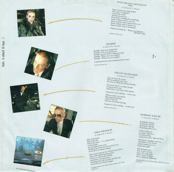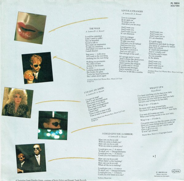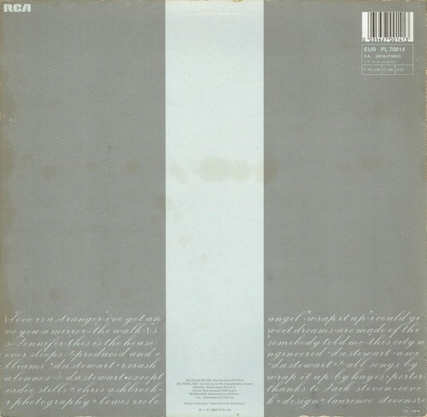 Title on front cover: Sweet Dreams = Are Made Of This ∙» Title on spine: Sweet Dreams/Are Made Of This/ Runout parts "020 A-7686-A-2" and "020 A-7686-B-2" including the following Roman numerals are etched; the rest is stamped. Cat# PL 70014 is on the spine, rear cover, inner sleeve and labels;RCALP 6063 is on the spine, rear cover and inner sleeve. On the rear cover PL 70014 is noted as an "EUR" cat# and RCALP 6063 is noted as a "U.K." cat#. On rear cover: Belgique/Belgie: Distributed by RCA S.A. Deutschland: Vetrieb durch RCA Schallplatten GmbH France: Distribué par RCA S.A. Italia: Distributed by RCA S.p.A. Nederland: Distributed by RCA B.V. U.K.: Distributed by RCA Ltd. Made in Germany ∙ Fabrication en Allemagne ℗ + © 1983 RCA Ltd. On inner sleeve: A3 featuring guest vocalist Green, courtesy of Scritti Politti and Rough Trade Records A1, A2, A5, B3, B4 Arnakata Music Ltd./Warner Bros. Music Ltd./Logo Songs Ltd. A3 Warner Bros. Music Ltd./Copyright Control A4, B1, B2, B5 Sunbury Music Ltd. ℗ 1983 RCA Ltd. Made in Germany Fabrication en Allemagne On labels: Marketed by RCA Records from master recordings of RCA Records used by authority of RCA Corporation Made in Germany. Fabriqué en Allemagne A1, A5 Arnakata Music/Warner Bros. Music Ltd./Logo Songs Ltd. A2, B4 RCA Music Ltd./Logo Songs Ltd. A3 Warner Bros. Music Ltd./Rondor Music (Ldn.) Ltd. A3, B1, B2, B5 Sunbury Music Ltd. B3 Arnakara [sic] Music/Warner Bros. Music Ltd./Logo Songs Ltd. A1, A5, B3 ℗ 1982, A2 to A4, B1, B2, B4, B5 ℗ 1983 RCA Ltd. Writing credits are printed as "Lennox-Stewart" on all tracks except for A3 where they are printed as "Hayes-Porter" on labels. Production credits are printed as "Stewart/Williams" or "Stewart/Crash" on labels. [r=163971] has an "FG" UK price code on the rear cover. [r=5120995] has no barcode on the rear cover. [r=66534] has no barcode on the rear cover.