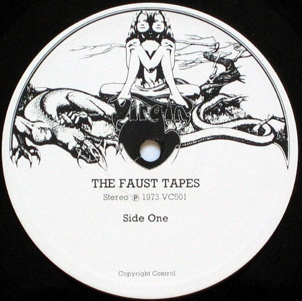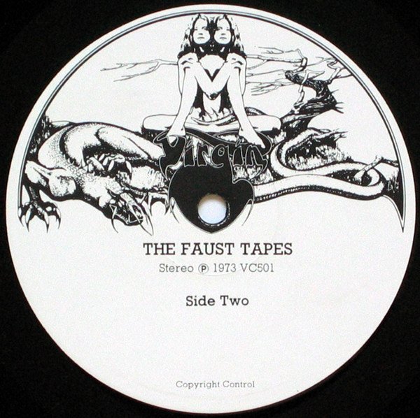 ℗ 1973 ℗ Virgin Records Ltd. Distributed by EMI & Island. Text panel at the top of the front cover: "The music on this album, drawn from Faust's own library of private tapes, was recorded informally and not originally intended for release. However, since British interest in the group has been unusually great, it has been decided to make some of this unofficial material available to the public in this country. These tapes have been left exactly as they were recorded - frequently live - and no post-production work has been imposed on them. The group wish to make it clear that this is not to be regarded as their third album, but a bonus release - on sale at the current price of a single - to mark their signing with Virgin Records, for whom they will shortly be recording their next official album. The Faust Tapes reveals Faust at their most personal and spontaneous. It's a unique glimpse behind the scenes of a group which European and British critics have hailed as one of the most exciting and exploratory in the world. Virgin Records" The rest of the front cover text is made out of press quotes from: Best, Rock & Folk, Sounds, Disc, Extra, Pop Music, and New Musical Express. Black & white 'twins' Virgin labels indicate Side One and Side Two without any track titles, some parts were specified on later reissues. Musicians are uncredited. The cover has a 'fluted spine' (pinched at both edges). Catalogue number variations: VC501 on cover spine and labels VC 5o1 on top-right of front cover The runouts are stamped.