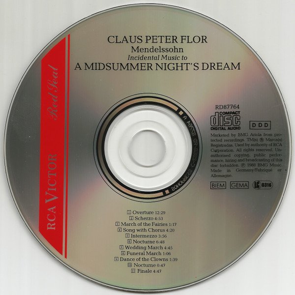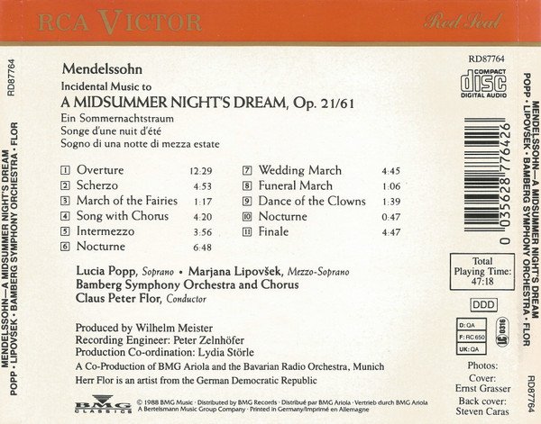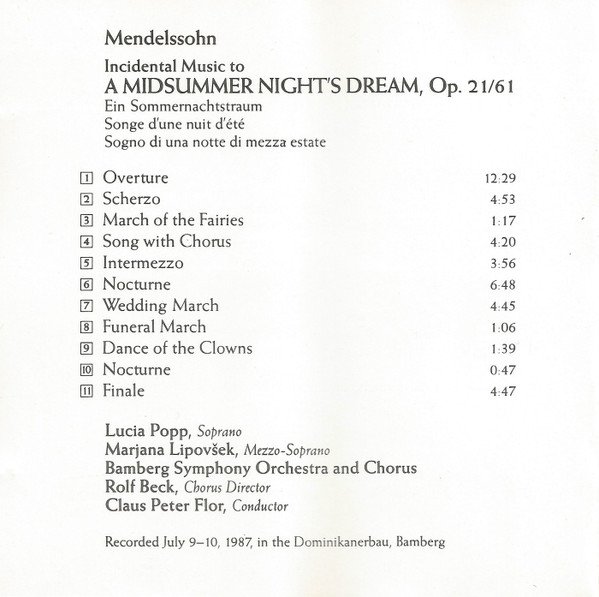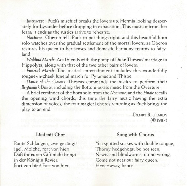 Release is packaged in a clear jewel case with an opaque black disc tray. Includes a 20-page booklet with lyrics and a back cover inlay. The booklet is in English, German, French and Italian. © 1988 [l34190] ℗ 1988 [l34190] Ein Sommernachtstraum Songe d’une nuit d’été Sogno di una notte di mezza estate Recorded July 9–10, 1987, in the [l282832]. Total playing time: 47:18 Back booklet photo: New York City Ballet principal dancer Maria Calegari. Printed in Germany. Disc made in Germany.