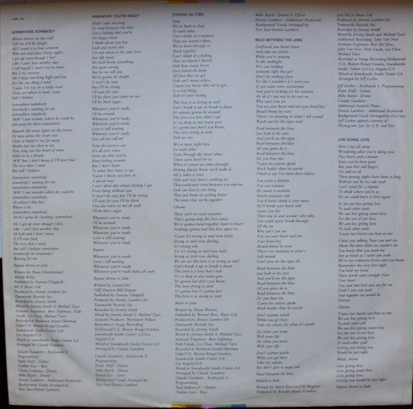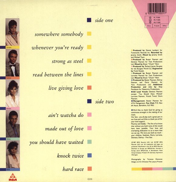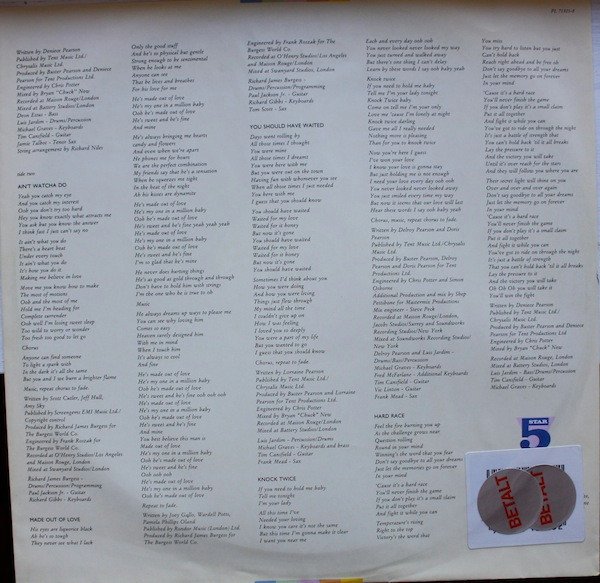Inner sleeve contains lyrics. Track A1: Published by Famous Chappell/MCA Music Ltd. Produced for Tuneworks Records Inc. Recorded at Buckman Studio/Sherman Oaks/CA, Maison Rouge/London, Soundcastle Studio Center LA/Los Angeles/CA. Mixed at Soundcastle Studio Center LA/Los Angeles/CA. Track A2: Published by Famous Chappell. Produced for Tuneworks Records Inc. Recorded at Image Recording/Hollywood/CA, Maison Rouge/London, Soundcastle Studio Center LA/Los Angeles/CA. Mixed at Soundcastle Studio Center LA/Los Angeles/CA. Track A3: Published by Warner Bros. Music Ltd. Produced for Tuneworks Records Inc. Recorded at Buckman Studio/Sherman Oaks/CA, Maison Rouge/London, Soundcastle Studio Center LA/Los Angeles/CA. Mixed at Soundcastle Studio Center LA/Los Angeles/CA. Track A4: Published by Rondor Music (London) Ltd./MCA Music Ltd. Produced for Tuneworks Records Inc. Recorded at Image Recording/Hollywood/CA, Maison Rouge/London, Soundcastle Studio Center LA/Los Angeles/CA. Mixed at Soundcastle Studio Center LA/Los Angeles/CA. Jeff Lorber appears courtesy of Phonogram Ltd. for U.K. and Eire. Track A5: Published by Tent Music Ltd./Chrysalis Music Ltd. Produced for Tent Productions Ltd. Recorded at Maison Rouge/London. Mixed at Battery Studios/London. Track B1: Published by Screengems EMI Music Ltd./Copyright Control. Produced and engineered for The Burgess World Co. Recorded at O'Henry Studios/Los Angeles and Maison Rouge/London. Mixed at Swanyard Studios/London. Track B2: Published by Rondor Music (London) Ltd. Produced and engineered for The Burgess World Co. Recorded at O'Henry Studios/Los Angeles and Maison Rouge/London. Mixed at Swanyard Studios/London. Track B3: Published by Tent Music Ltd./Chrysalis Music Ltd. Produced for Tent Productions Ltd. Recorded at Maison Rouge/London. Mixed at Battery Studios/London. Track B4: Published by Tent Music Ltd./Chrysalis Music Ltd. Produced for Tent Productions Ltd. Additional Production and mix for Mastermix Productions. Recorded at Maison Rouge/London, Jacobs Studios/Surrey and Soundworks Recording Studios/New York. Mixed at Soundworks Recording Studios/New York. Track B5: Published by Tent Music Ltd./Chrysalis Music Ltd. Produced for Tent Productions Ltd. Recorded at Maison Rouge/London. Mixed at Battery Studios/London. Managed for ATA Management. Sleeve: ℗ & © 1987 BMG Records (UK) Ltd. Distributed in the UK by BMG Records. Distributed in Europe by BMG/Ariola. Printed in W. Germany. Labels: ℗ 1987 RCA (UK) Ltd. Marketed by RCA Records from master recordings of RCA Records. Made in Germany.