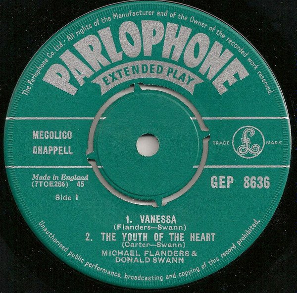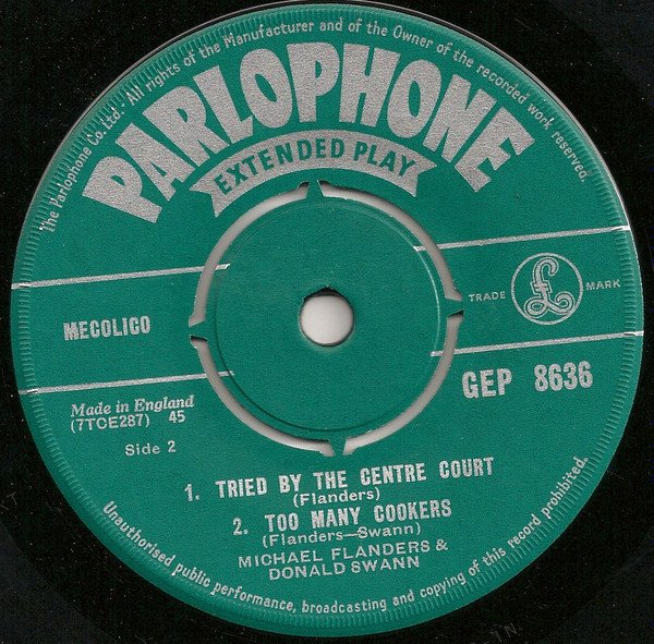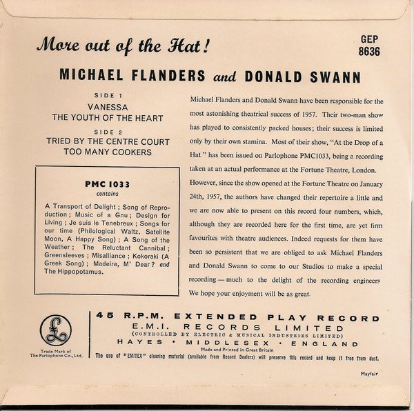 Michael Flanders and Donald Swann on sleeve Michael Flanders & Donald Swann on labels Similar to [r2784519] which is printed by [l446533]. This version has no reference to ET in the run-out stamp unlike this version [r10989658] which has both an ET & an XT stamp in the run-outs.Chappell only on A