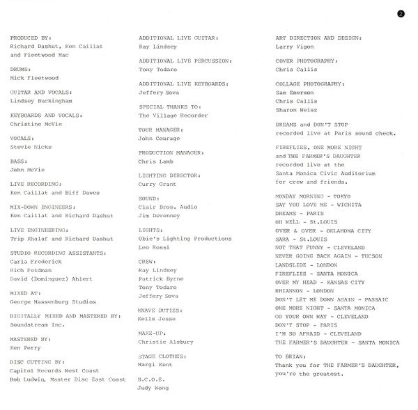 Recorded during the "Tusk Tour" 1979/1980. Gatefold cover. Inner sleeves are printed with the Tusk Tour dates and the number of attendants at each concert. 1st cat. # on the sleeve, 2nd. and 3rd. on the labels, where 2WB 3500 appears within brackets. The runouts are etched on each side apart from 'MASTERDISK' and the Europadisk logo (EDP) and some stamped sideway numbers. On variant 1, the "2-WB-1-3500-E-4" parts are thinly scratched over.