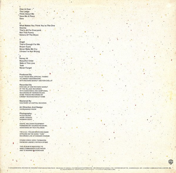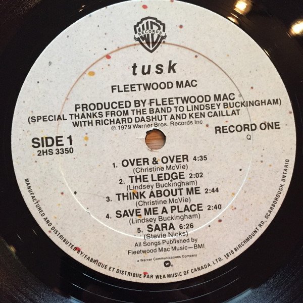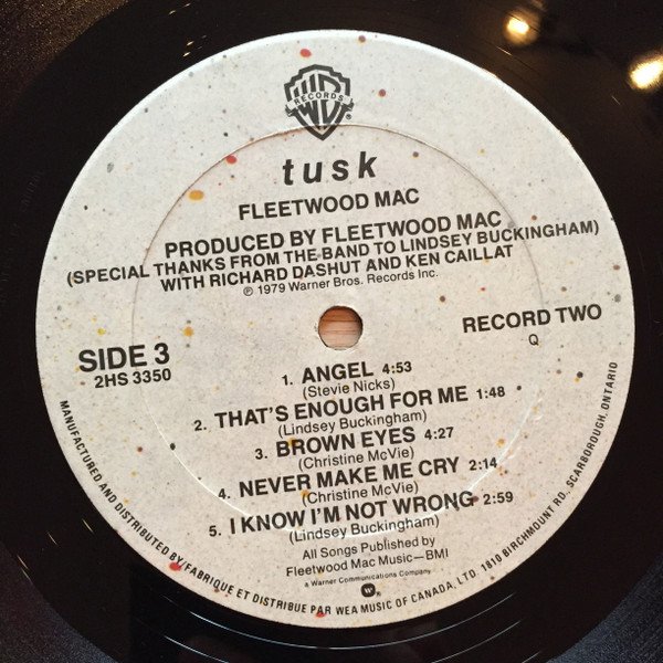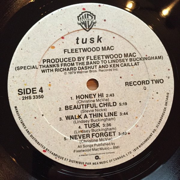 Released in a single textured sleeve with embossed card on the front cover. Incl. two cardboard covers with each an cardboard inner sleeve. All are individually printed. On the spine: 2HS 3350 FLEETWOOD MAC . TUSK Litho in Canada ℗ 1979 WARNER BROS. RECORDS INC. LITHO IN CANADA On the labels: ℗ 1979 Warner Bros. Records Inc., MANUFACTURED AND DISTRIBUTED BY / FABRIQUE ET DISTRIBUE PAR WEA MUSIC OF CANADA LTD. 1810 BIRCHMOUNT RD, SCARBOROUGH, ONTARIO Digital mix-down equipment furnished by Soundstream Inc. The U.S.C. Trojan Marching Band appears on the song "Tusk" recorded live at Dodger Stadium. This album is dedicated to Wing Commander Fleetwood and to Morris Buckingham. © 1979 Warner Bros. Records Inc. / Manufactured and distributed by WEA Music Of Canada, LTD./Fabrique Et Distribue Par WEA Musique Du Canada, LTEE./1810 Birchmount Rd., Scarborough, Ont. A Warner Communications Company ⓦ The spine has: [Ever Reddy logo] Litho in Canada