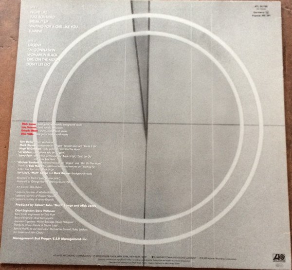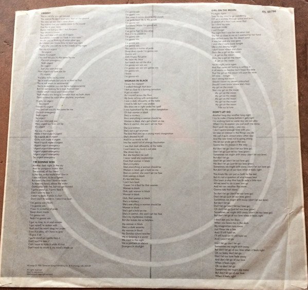 Issued in a semi-glossy sleeve with Ⓤ on rear; poly-lined inner with lyrics printed in red for side A and in black for side B. All songs © 1981 Somerset Songs Publishing Inc. & Evansong Ltd., ASCAP Recorded at Electric Lady Studios, N.Y.C. Mastered [at] Sterling Sound, N.Y.C. Jr. Walker appears courtesy of Whitfield Records. Larry Fast appears courtesy of Passport Records. Michael Fonfara appears courtesy of Arista Records. ℗ © 1981 Atlantic Recording Corporation Made in Germany by WEA Musik GmbH. Additional cat# on back (SD 16999) and on labels SD 16999.