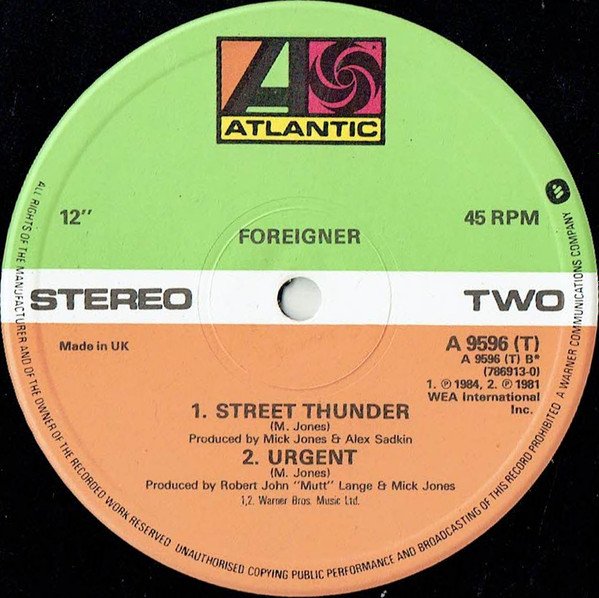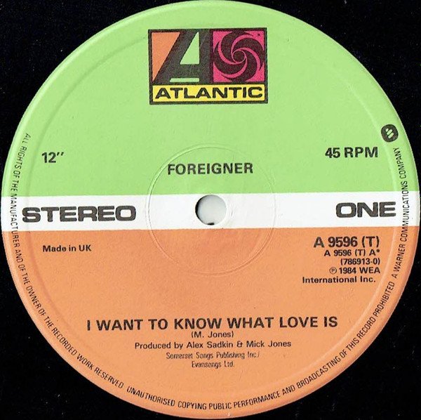 'Extended Version' for Track A is only listed on sleeve."I Want To Know What Love Is" from the forthcoming album [url=http://www.discogs.com/Foreigner-Agent-Provocateur/master/82439]'Agent Provocateur'[/url]."Urgent" from the album [url=http://www.discogs.com/Foreigner-4/master/82436]'4'[/url] (LP K50796, Cass. K450796)© 1984 An Atlantic Recording. Distributed by WEA Records Ltd. A Warner Communications Co.[Labels] Track A: Somerset Songs Publishing Inc. / Evansongs Ltd. Tracks B1, B2: Warner Bros. Music Ltd. ℗ 1984 [Tracks A, B1], ℗1981 [B2] WEA International Inc. Made in UK[Catalog# variants] On labels: A 9596 (T) (786913-0) On rear sleeve: A9596T (786 913-0)Released in a flat sleeve. Track durations are not listed on the release.Another version pressed by Damont is here, [r5020734]. Also released in a company sleeve, see [r6220420].