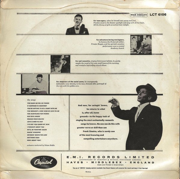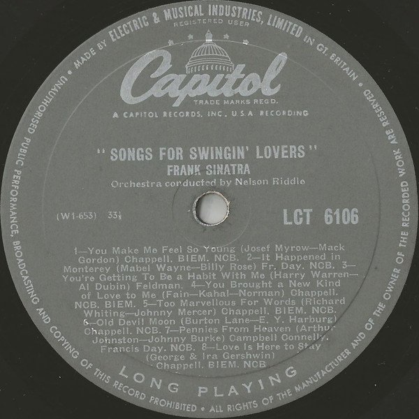 Original UK Mono release with grey Capitol labels and fully laminated flipback sleeve First Pressings have R/T Tax code slug. (from March 1956- 31st May 1957) This version with X/T tax code from 1st June 1957 (to 30th Sept 1958)