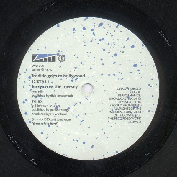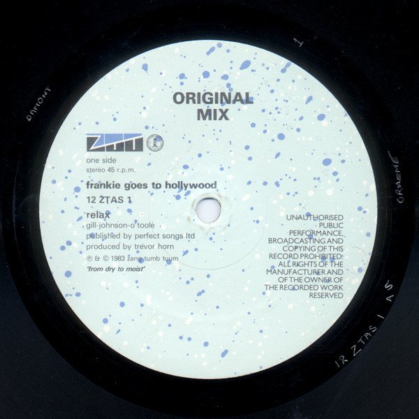 This version of the single is a reissue of [url=http://www.discogs.com/release/33482]the UK first edition 12"[/url], issued in 1984. It was issued in speckled, gray, glossy "who! chance? blink!?" ZTT die-cut sleeve. Side A is labeled "Relax" with no mix title, but the phrase "Original Mix" at the top of the label. The record actually plays the 16:24 "Relax (Sex Mix)", mastered at 45 RPM. Please see the [url=http://www.discogs.com/master/74500]Master Release Notes[/url] for links to other similar 12 ZTAS 1 releases.