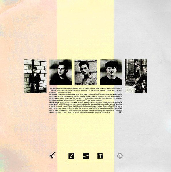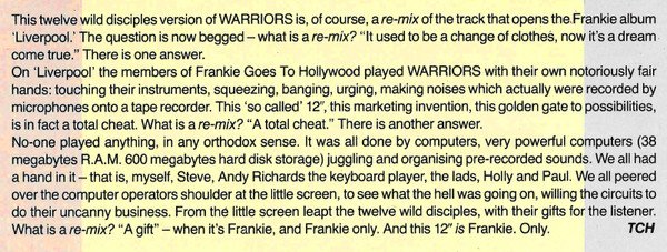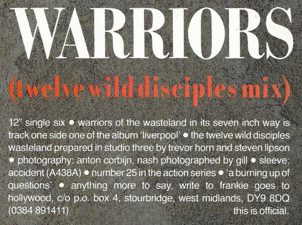 "Number 25 in the Action Series." Sleeve notes: This twelve wild disciples version of WARRIORS is, of course, a re-mix of the track that opens the Frankie album 'Liverpool'. The question is now begged – what is a re-mix? 'It used to be a change of clothes, now it's a dream come true.' There is one answer. On 'Liverpool' the members of Frankie Goes To Hollywood played WARRIORS with their own notoriously fair hands: touching their instruments, squeezing, banging, urging, making noises which were recorded by microphones onto a tape recorder. This 'so-called' 12", this marketing invention, this golden gate to possibilities is in fact a total cheat. What is a re-mix? 'A total cheat.' There is another answer. No-one played anything, in any orthodox sense. It was all done by computers, very powerful computers (38 megabytes R.A.M. 600 megabytes hard disk storage) juggling and organising pre-recorded sounds. We all had a hand in it – that is, myself, Steve, Andy Richards the keyboard player, the lads, Holly and Paul. We all peered over the computer operators shoulder at the little screen, to see what the hell was going on, willing the circuits to do their uncanny business. From the little screen lept twelve wild disciples, with their gifts for the listener. What is a re-mix? 'A gift.' – when it's Frankie, and Frankie only. And this 12" is Frankie. Only. TCH" ℗Zang Tuum Tumb 1986 ©Zang Tuum Tumb 1986 Manufactured and distributed by Island [logo]. Durations not listed on release. Runouts are etched except NICKZ and PENTHOUSE.