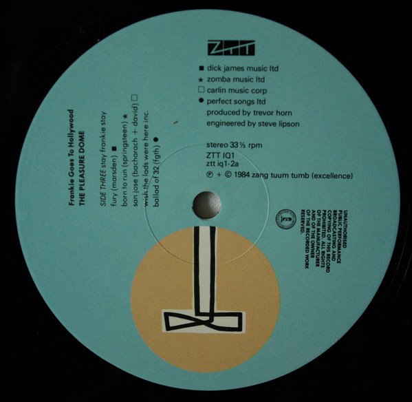 Gatefold sleeve with printed inner sleeves (round corners). Some copies came with a sticker with European cat# 302 419-977 on upper right corner of back cover (UK version imported to mainland Europe?) From sleeve notes: IQ number one becomes no.four in Zang Tuum Tumb's fishy Action Series. "Ain't that peculiar." Record two's inner sleeve includes a mail order form for FGTH accessories, such as the "Sophisticated Virginia Woolf vest for the luxury of life" and the "Jean Genet boxer shorts", modelled by Paul Rutherford of the group Frankie Goes To Hollywood and Claudia Bruecken [sic] of the group Propaganda ... "[4 symbols] x (frankie symbol) = BANG! (the spunk plus the bomb plus the pump plus the torture instrument times frankie equalling the bang is an exclusive piece of ZTT exploitation.)" © ZTT 1984 A1, A2, A4, B1, B3, C4, C5, D1, D2, D3, D4, D5: Perfect Songs Ltd A3, C1: Dick James Music Ltd B2: Jobete Music (UK) Ltd C2: Zomba Music Ltd C3: Carlin Music Corp Side A banded as one continuous piece. Spelling inconsistencies (intentional or otherwise) appear on release: • title listed as Welcome To The Pleasuredome on front, spine and inner sleeve / The Pleasure Dome on labels; • track C1 listed as 'ferry (Go)' on inner sleeve / 'fury' on label. • track D1 listed as 'Krisco Kisses' on inner sleeve / 'Ḱrisco Ḱisses' on label.