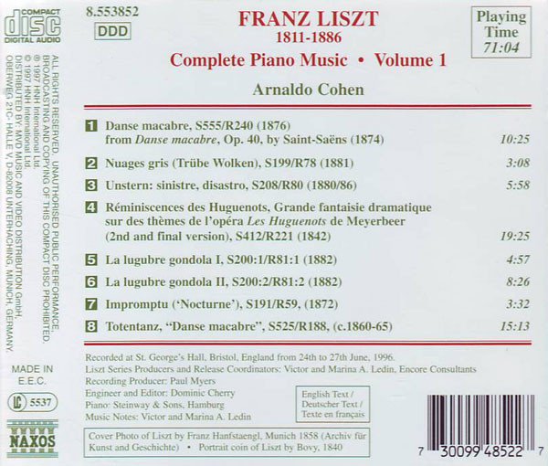 ℗ © 1997 HNH International Ltd. Distributed by MVD Music and Video Distribution GmbH, Unterhaching, Munich, Germany. Recorded at St. George's Hall, Bristol, England from 24th to 27th June, 1996. Cover: photo of Liszt, Munich 1858 (Archiv für Kunst und Geschichte). Includes a 24 page booklet in English, German & French. Total playing time: 71:04. Naxos logo on this version is multicolored and on the back there is no URL printed on the back. [url=https://www.discogs.com/release/9602770]A version[/url] with the URL www.hnh.com right above the barcode and with in a single colored logo (green) on the front also exists.