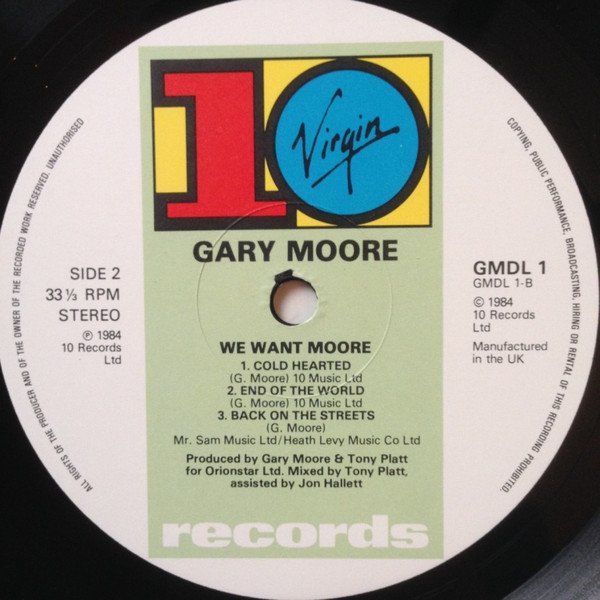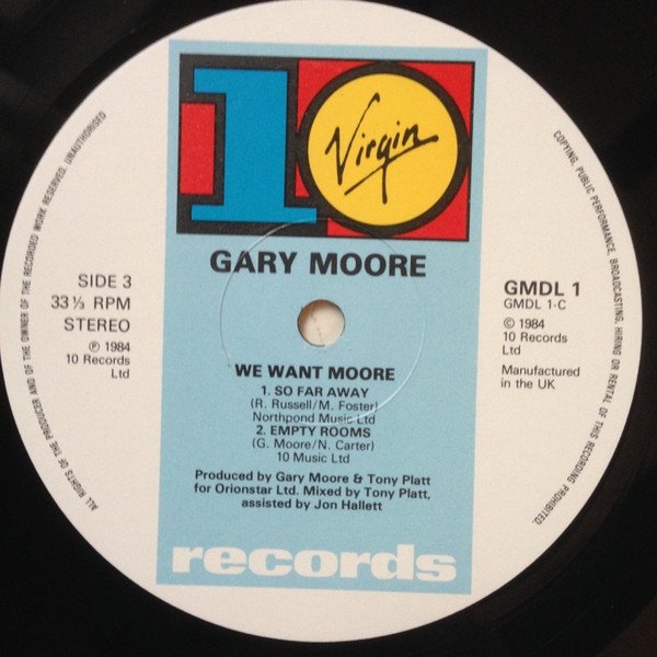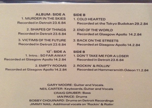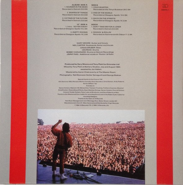 Gatefold sleeve. Recorded Live in Concert. A1 to A3, D1 recorded in Detroit 23.6.84 B1 recorded at the Tokyo Budokan 29.2.84 B2 to C2 recorded at Glasgow Apollo 14.2.84 D2 recorded at Hammersmith Odeon 11.2.84. Special thanks to Geddy, Alex and Neil. Mixed by Tony Platt at Battery Studios, July and August 1984; Assisted by Jon Hallett. Initial copies included a Gary Moore "Family tree" insert. Publishers: A1, A3, B1, B2, C2, D1: 10 Music Ltd. A2: D. Feldman t/a Yardbirds Music Co/EMI Music Ltd B3: Mr. Sam Music Ltd/Heath Levy Music Co Ltd C1: Northpond Music Ltd. D2: Mr. Sam Music Ltd./Heath Levy Music Co/Aviation Music ℗ © 1984 10 Records Ltd. [l754] pressed release showing an external, non-EMI facility. Lacquer cutting represented by the letters "1U" in matrices. All Matrices are stamped except "Arun" and "AC" which are etched. Manufactured in the UK.