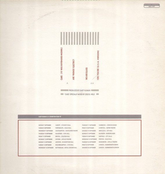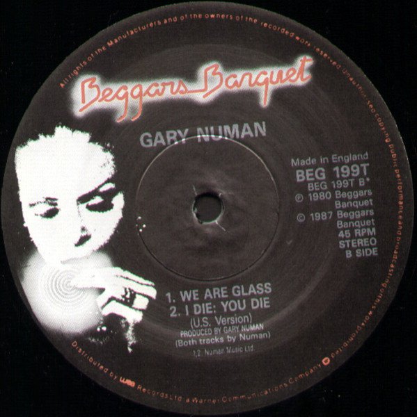 Has 1987 UK tour dates printed on back sleeve. I Die : You Die listed as U.S.A Version on front and rear of cover but as U.S. Version on centre label. Distributed by Wea Records Ltd. a Warner Communications Company Made In England A1 ℗ & © 1987 Beggars Banquet A2 ℗ 1979 Beggars Banquet © 1987 Beggars Banquet B1, B2 ℗ 1980 Beggars Banquet © 1987 Beggars Banquet A1, A2 Beggars Banquet Music Ltd./ Momentum Music Ltd. B1, B2 Numan Music Ltd. Stamper/metalwork by Musitech, High Wycombe.