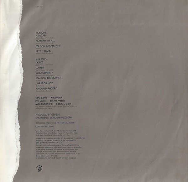 Embossed sleeve. Printed inner bag without Virgin logo. ℗ & © 1981 B1: Dodo/Lurker are listed as two separate tracks on the cover/labels. Inner bag: Marketed by Charisma Records Ltd. Labels: Marketed by Phonogram Ltd. Recorded and mixed at The Farm, Surrey. EWF Horns on 'No Reply At All' courtesy of Earth, Wind and Fire. All matrix runouts are stamped.
