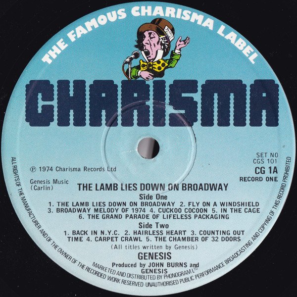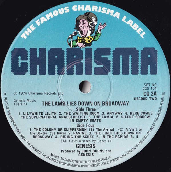 1980s Blue Charisma label with small "Mad hatter" illustration In a matt, gatefold sleeve with illustrated lyric inner sleeves (B4) Credited as "Carpet Crawl" on the sleeve reverse and inner disc labels Track D6 - Track title printed as 'it' on the label and inner sleeve, and printed as 'IT' the on sleeve (Sleeve notes) Recorded in Wales with the Island Mobile Studio. Marketed by B and C Records Limited, 37 Soho Square, London W1. Printed and Made by Bruin B.V. Zaandam / Holland (Label notes) ℗ 1974 genesis Music / Carlin Marketed and distributed by Phonogram Ltd.
