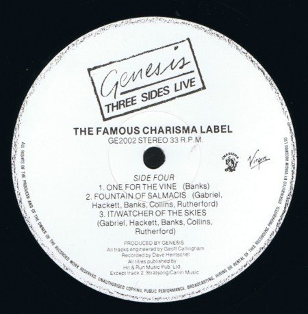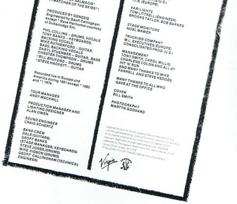 Track A2 "Dodo" also includes the track "Lurker" although not credited. Recorded live in Europe and America during 1981 except B4, D1, D2 (1980) and D3 (1976). Engineered by Dave Hentschel courtesy of Dukeslodge Ent. Gatefold Sleeve. Both the Virgin and Charisma logos appear on the back-cover and labels. 'Distributed by Virgin Records Ltd' appears in the label rim-text. The original Charisma release was distributed by Polygram. All songs published by Hit & Run Music Pub. Ltd. except C2 Genesis Music D2 Stratsong/Carlin Music Durations do not appear on this release.