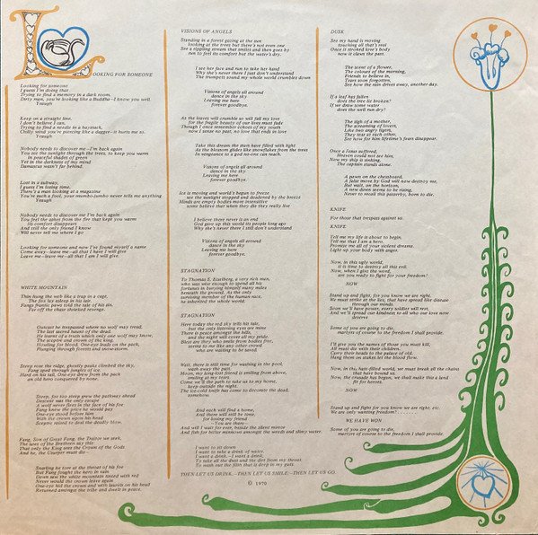 UK repress in fully textured gatefold cover on large 'hatter' labels. One-side-printed light grey paper lyrics insert. First cat.# on cover inside gatefold, 2nd on labels.Recorded at Trident Studios, London.℗ 1970 © 1970Sleeve: "Manufactured and distributed by B&C Records Ltd, 37 Soho Square, London W1. (01734 3932). Printed and made by the E. J. Day Group, London and Bedford."All matrix runouts are stamped.