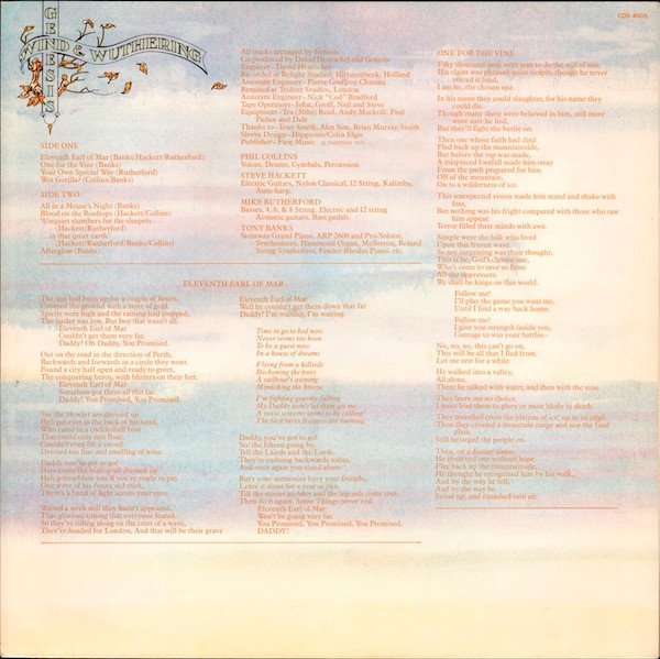 Issued on 'The Famous Charisma Label' with pink background Mad Hatter design in a textured sleeve and printed inner with lyrics and credits. Labels: ℗ 1976 Charisma Records Ltd All titles Fuse Music Ltd Sleeve: © Charisma 1976 Inner: Recorded at Relight Studios, Hivarenbeek, Holland Remixed at Trident Studios, London Publisher - Fuse Music © Charisma 1976 Title appears on spine and labels as "WIND AND WUTHERING". Note: Track durations not mentioned on record or sleeve. Track durations taken by timing. Runouts: stamped, except some part etched (see description field in BaOI)