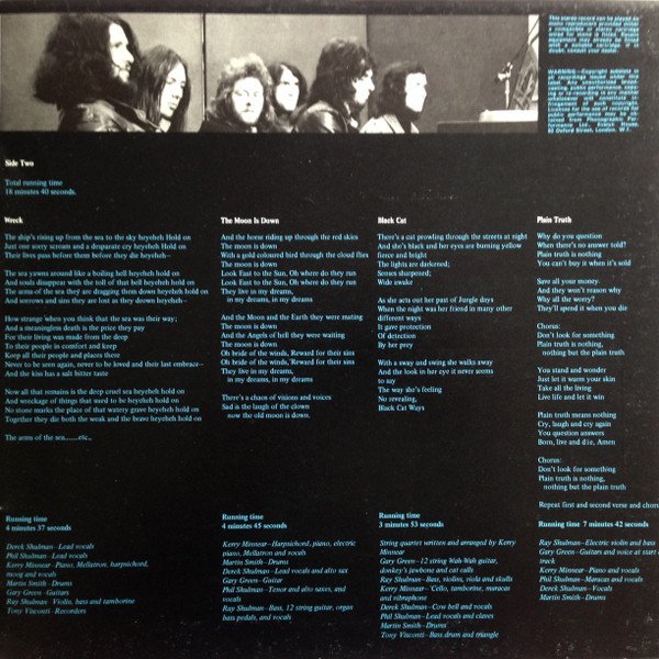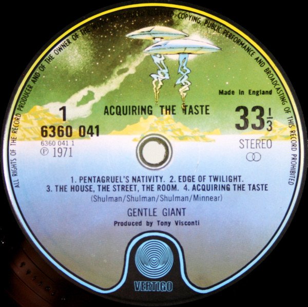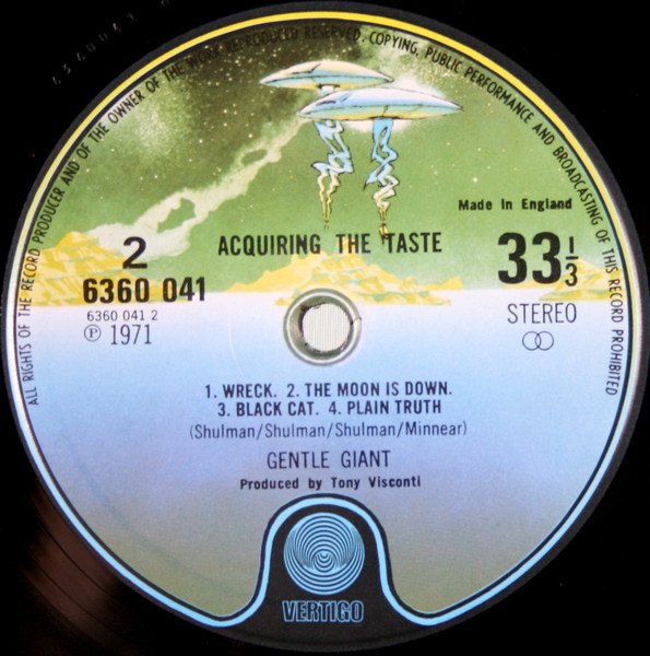 Re-pressing with full-colour "UFO" Vertigo labels. This version retains the original catalogue number "6360041" printed in red on the back sleeve above "VO PRICE CODE"; (compare [r=3142848], where "6360-041" is printed in black). First catalogue number "6360041" on the back sleeve, 2nd "6360 041" on the labels. Some copies have polylined inner sleeve with printed text: U.K. Patent No. 1,072,844. Brevete SGDG 1,405,719 Eire 28160 MADE IN ENGLAND R.S. 4913 000 15801 541 [Sleeve notes]: We are deeply indebted to: Martin Rushent, Big A and Garybaldi at Advision Studios. Bill Price at A.I.R. Studios. ℗ 1971 The runouts are stamped; the ✱ stands for crossed digits and letters.