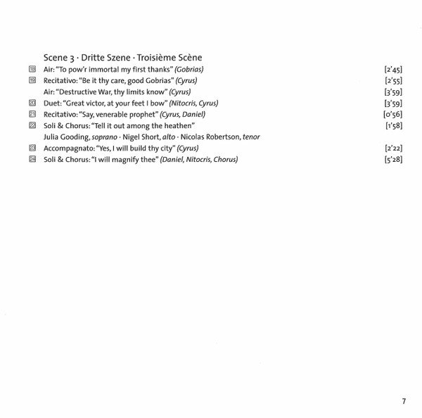 | 3-19 | Recitativo: "Be It Thy Care, Good Gobrias" (Cyrus) Air: "Destructive War, Thy Limits Know" (Cyrus) | 2:55 |
