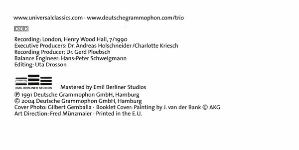 Recording: London, Henry Wood Hall, 7/1990 ℗ 1991 Deutsche Grammophon GmbH, Hamburg © 2004 Deutsche Grammophon GmbH, Hamburg Made in the E.U. Printed in the E.U. Fat double jewel case, 28-page booklet with notes in English and German. Please note that this repress of the 2004 reissue was released in 2005 or later, since manufacturer [l384133] started operations in 2005.
