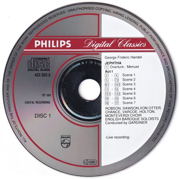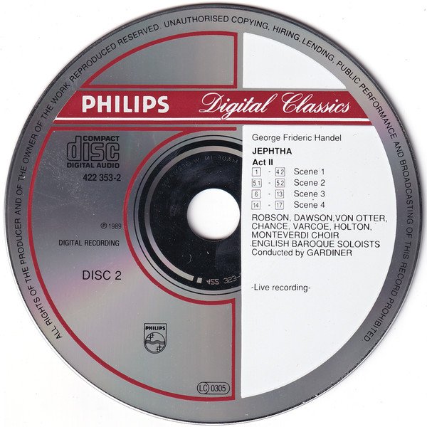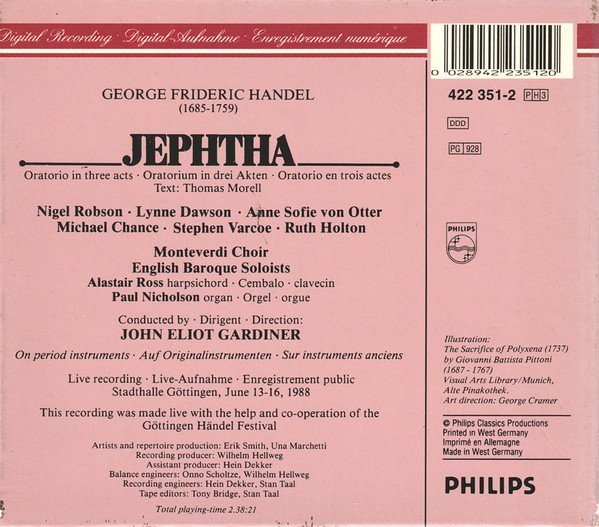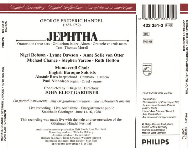 Total Time: 2.38:21 Live recording, Stadthalle Göttingen, June 13-16, 1988 © 1988, 1989 Philips Classics Productions ℗ 1989 This recording was made live with the help and cooperation of the Göttingen Händel Festival Includes 98-page booklet with essays, photographs, and libretto.