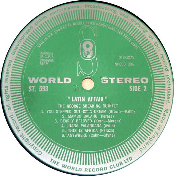 Front cover denotes just George Shearing, but rear cover and labels credit the Quintet. Released in ~1967 according to the label discography. Version with green label design and a stereo sticker on the rear cover. Mono and stereo versions have identical sleeves with the same catalogue number - "T 598". The mono version has "T. 598" on its labels, while the stereo has "ST. 598". The stereo was issued with a rectangular "stereo" sticker on the sleeve.