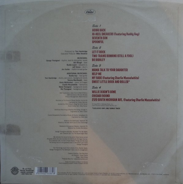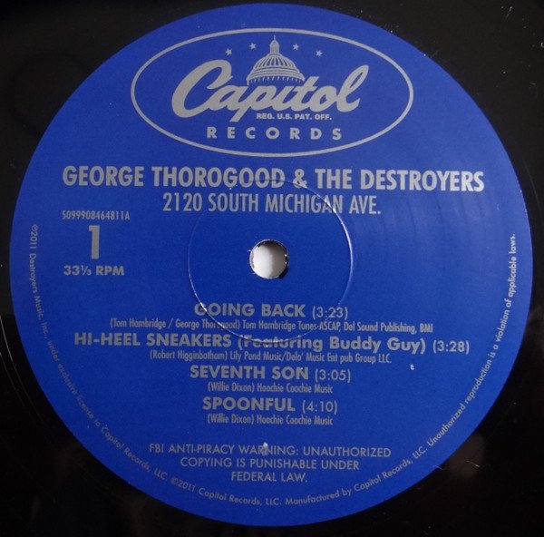 "Sweet Little Rock And Roller" is marked as "Exclusive Vinyl Only Bonus Track" Recorded at The House Of Blues Studios, Encino, CA. Additional recording at RaxTrax Recording, Chicago, IL. Charlie Musselwhite recorded at Route 44 Studio, Sebastopol, CA. Mixed at The Switchyard, Nashville, TN. Mastered at Georgetown Masters, Nashville, TN. Buddy Guy appears courtesy of Jive Records Charlie Musselwhite appears courtesy of Alligator Records. Photo by Brian To - www.briantophoto.com All runouts are etched. Released in a wider single cover to accomodate 2x180gram vinyl records and generic white polylined inner sleeves die cut to see labels. George Thorogood dedicates "My Babe" For My Babes and "Seventh Son" For The Secret Agent Man. We dedicate this record to the entire Chess family and all the great artists who ever recorded at 2120 South Michigan Avenue. On a personal note, I'd like to thank Nanker Phelge and the boys for turning me on to the greatest music in the world! Let It Rock! - George Thorogood. This compilation ℗ 2011 Destroyers Music Inc. © 2011 Capitol Records, LLC. Some copies were signed by all members of the band and available to purchase from the merchandise stand on his then current UK tour.