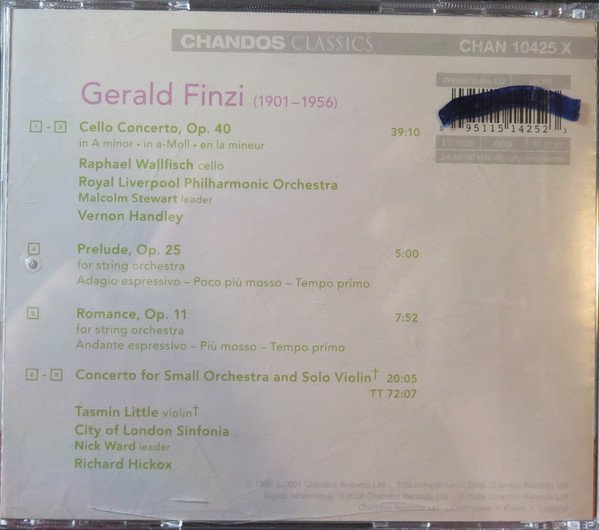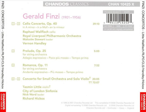 LINER: - 32 pages (stapled) - Page 2: Photograph of Gerald Finzi - Pages 3 to 4: Full tracklist and performer details / TT = 72:07 INLAY CARD: - Summary tracklist and performer details / TT = 72:07 / SPARS Code - Catalog Number (top right) - Barcode, Label Code, SPARS Code (top right) - "℗ 1986 & 2001 Chandos Records Ltd This compilation ℗ 2006 Chandos Records Ltd" Made in the EU (CD face) Printed in the EU (rear insert) Recording: February 6-7, 1986, Philharmonic Hall, Liverpool, Lancashire, England (1-3); December 2, 1999, Watford Colosseum (4-8)