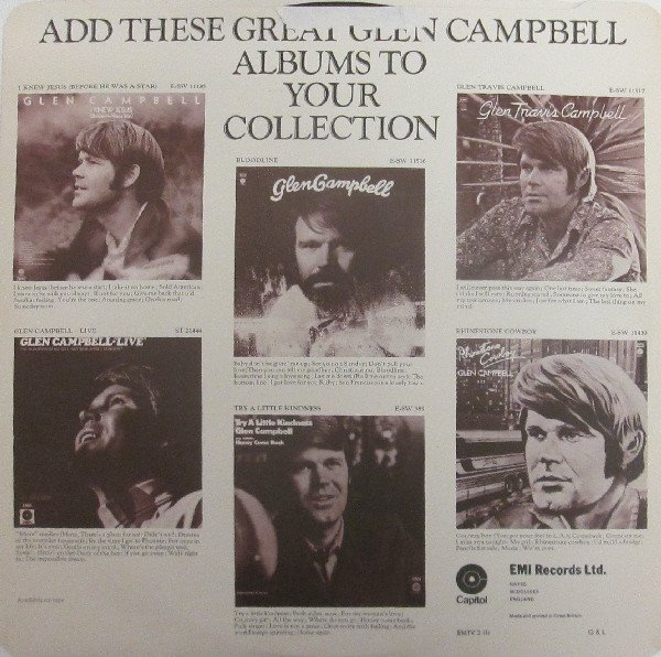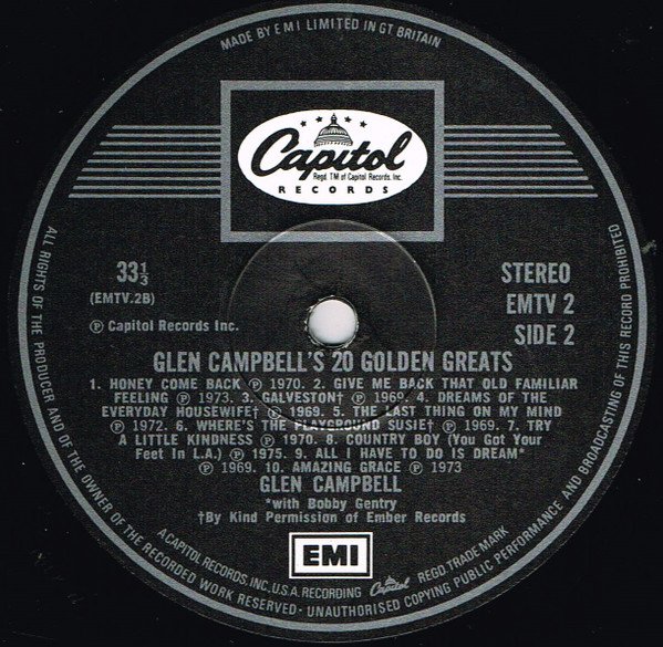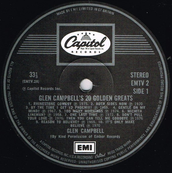 Laminated Sleeve Made and printed in Great Britain Label reads: Glen Campbell's 20 Golden Greats The Guinness Book of British Hit Albums states this release cat No EMTV 2 entered the charts in November 1976 Publishers etc: A1: Ardmore & Beechwood Ltd./KPM ℗1975 A2: Essex International ℗ 1970 A3: Carlin Music Corp. ℗1969 A4: Acuff Rose Publ. Ltd. ℗1967 A5: The Sparta Florida Mus. Group Ltd. Produced for Glenco Productions, Inc. ℗ 1974 A6: Warner Bros Music Ltd. ℗1968 A7: April Music Ltd. ℗1972 A8: Anchor Music Ltd./Acuff Rose Publ. Ltd. ℗1976 A9: Robbins Music Corp. Ltd. ℗1969 A10: Francis Day & Hunter Ltd. ℗1970 B1: Jobete-London Music ℗1970 B2, B10: The Sparta Florida Music Group Ltd. Produced for Glenco Productions, Inc.℗1973 B3: Jobete-London Music ℗1969 B4: Keith Prowse Music Publ. Co. Ltd./KPM ℗1969 B5: Harmony Music Ltd. Produced for Glenco Productions Inc. ℗1972 B6: Jobete-London Music. ℗1969 B7: Ardmore & Beechwood Ltd./KPM. ℗1970 B8: Anchor Music Ltd. ℗1975 B9: Acuff Rose Publ. Ltd. ℗1969
