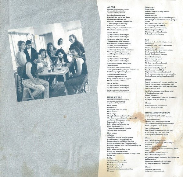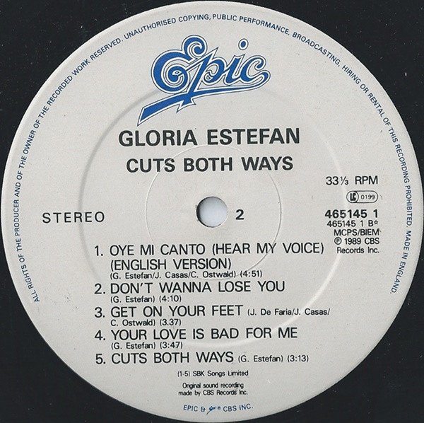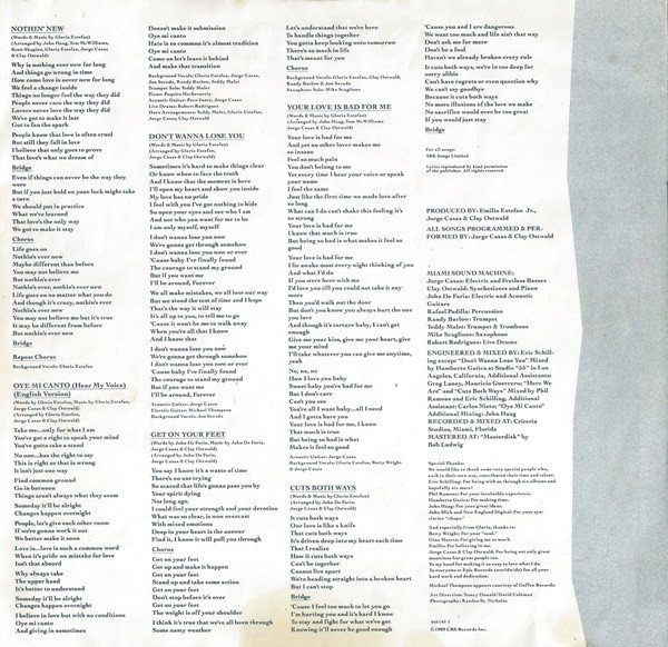 Cover spine credit: "Gloria Estefan & Miami Sound Machine". Cover front & label credit: "Gloria Estefan" Sleeve rear also credits "Miami Sound Machine" followed by individual names and roles. Comes with printed inner sleeve that has the lyrics printed on it. Sleeve: Also available on cassette Recorded & mixed at: Criteria Studios, Miami, Florida © 1989 CBS Records Inc. Distribution: CBS Records/CBS Disques S.A. Shorepak by Shorewood Packaging Limited England Inner sleeve: For all songs: SBK Songs Limited "Don't Wanna Lose You" mixed at Studio "55" in Los Angeles, California Recorded & mixed at: Criteria Studios, Miami, Florida © 1989 CBS Records Inc. Labels: Made in England. ℗ 1989 CBS Records Inc. SBK Songs Limited Original sound recording made by CBS Records Inc.