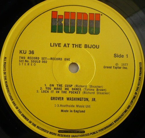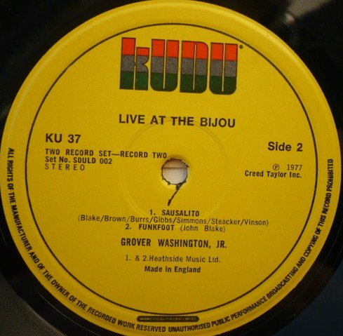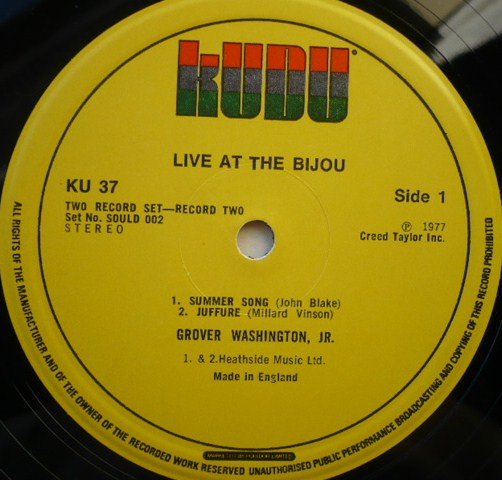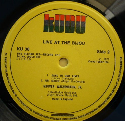 No track durations given. The B side is billed as a single track ('Days In Our Lives/Mr. Magic') on sleeve tracklist but shown as seperate tracks on label. Recorded at the Bijou Cafe, Philadelphia, PA., May 1977. Mixed at Electric Lady Studios. Kudu Super Double SOULD 002 This sound recording was made by Creed Taylor Inc. of 1 Rockefeller Plaza, New York, N.Y. 10020 and first published in the USA in 1977 â„— 1977 Creed Taylor Inc. Record manufactured and distributed in the U.K. by Polydor Ltd., 17-19 Stratford Place, London W1N 0BL Publisher details: Heathside Music Ltd. (A1 to B1, C1 to D2) Cyril Shane Music Ltd. (B2) Runout etchings: 'BOBBLES !' & 'MASTERBLOB' may be alias' of [a264258] who was cutting engineer for [l266218] at the time of this release.