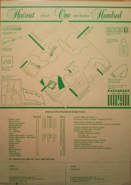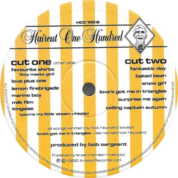 File under 'Haircuts' ℗ © 1982 Arista Records Ltd. Arista manufactured and distributed by Polygram Rec. Op. "REGIMENTAL" and "I DIDN'T PLAY" in the runouts are etched. In the runouts of side B the 2 before ▽ is stamped just above the 1.