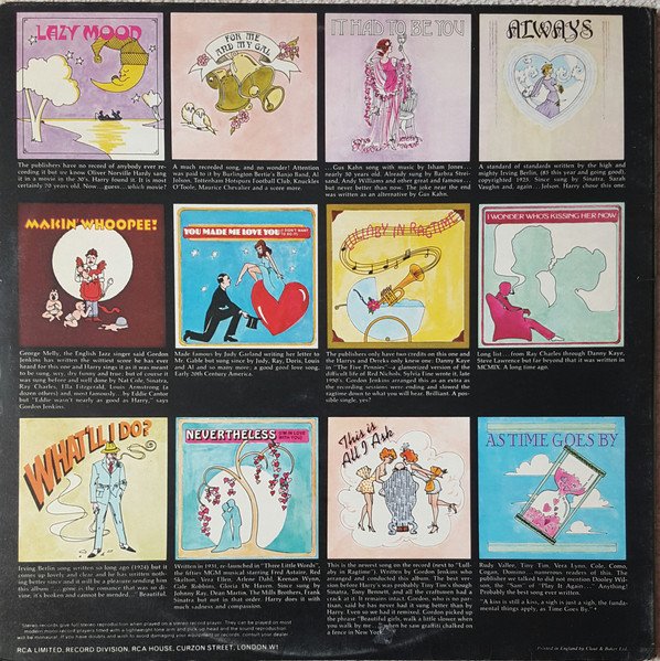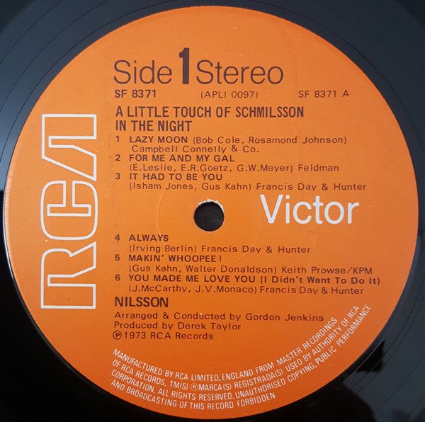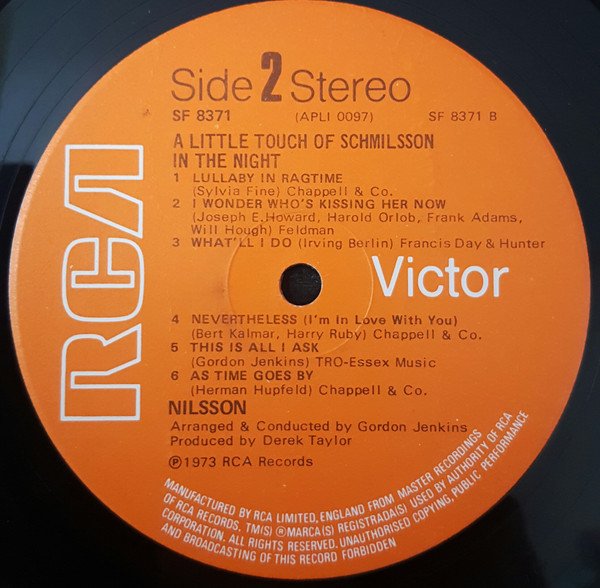 Matte gatefold sleeve. Orange RCA Victor labels. Sleeve: Recorded at CTS, The Music Centre, Wembley, London, between March 15 & March 22, 1973. Mixed, with a six-word overdub, between April 4 & April 6, 1973. "This Is All I Ask" was partially re-sung at RCA's New York studios on April 28 & 29, 1973, final remix at CTS May 7, 1973. Final masters cut at Apple Studios, May 8, 1973. Phillip McDonald by kind permission of Apple. A Nilsson House Production. © 1931 reproduced by kind permission of Chappell & Co. Ltd. This album is dedicated to Frank Wills. Printed in England by Clout & Baker Ltd. Labels: Publishing info - A1, A6: Campbell Connelly & Co. A2, B2: Feldman A3, A4, B3: Francis Day & Hunter A5: Keith Prowse / KPM B1, B4, B6: Chappell & Co. B5: TRO-Essex Music ℗ 1973 RCA Records Note: Same orange labels as [r=1595497], but with "Stereo" added to the right side of "Side 1" and "Side 2". Runouts are stamped and etched in several combinations: Variant 1: Side A is etched. Side B has the section starting "SF8371B-2S" stamped and the section starting "SF 8371-B-2S" etched. Variant 2: Both sides are etched. Variant 3: Not specified Variant 4: Both sides have the sections starting "SF-8371" are stamped and the sections starting "APL" are etched. Variant 5: Side A is etched. Side B has the section starting "SF-8371" stamped and the section starting "APL" etched. Variants 6, 7, 8: Both sides have the sections starting "SF-8371" are stamped and the sections starting "APL" are etched.
