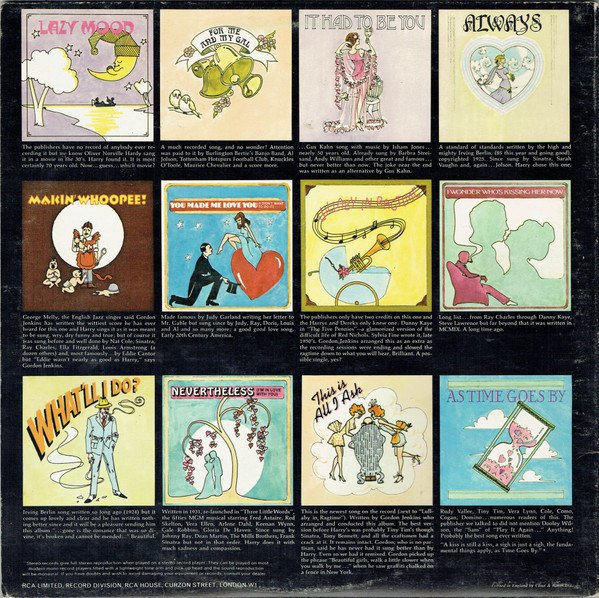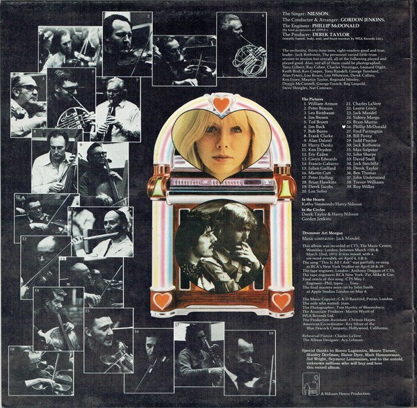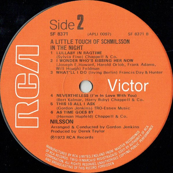 Gatefold cover, printed inner sleeve. Artist credit on spine: Harry Nilsson 'RCA' is on the front cover and spine; 'RCA Records' is on the inner sleeve; 'RCA Victor' is on the labels. Cat# SF 8371 is on the front cover, spine and labels; APL1-0097 is on the front cover and spine; SF-8371 is on the inner sleeve; APLI 0097 is on the labels. On rear cover: RCA Limited, Record Division, RCA House, Curzon Street, London W1 Printed in England by Clout & Baker Ltd. On inside gatefold: Phillip McDonald by kind permission of Apple. Derek Taylor warmly loaned, body, soul and heart-murmur by WEA Records Ltd. This album was recorded at CTS, The Music Centre, Wembley, London, between March 15th & March 22nd, 1973. It was mixed, with a six-word overdub, on April 4, 5 & 6. The song "That Is All I Ask" was partially re-sung at RCA's New York Studios on April 28 & 29. The tape engineer, London: Anthony Duggan of CTS. The tape engineers RCA New York: Pat, Mike & Gus. Final mix of this song: CTS May 7. Engineer—Phil, tapes ...Tony. The final masters were cut at Apple Studios London on May 8. The music copyist: G & D Bamford, Presto, London. The photographer: Tom Hanley of Bloomsbury. The associate producer: Martin Wyatt of WEA Records Ltd. American Co-ordinator: Roy Silver of the Blue Peacock Company, Hollywood, California. A Nilsson House production. This album is dedicated to Frank Wills. On inner sleeve: Printed in England On labels: Manufactured by RCA Limited, England from master recordings of RCA Records ℗ 1973 RCA Records A1 Campbell Connelly & Co. A2, B2 Feldman A3, A4, A6, B3 Francis Day & Hunter A5 Keith Prowse/KPM B1, B4, B6 Chappell & Co. B5 TRO-Essex Music [r=6961226] has orange labels with "stereo". [r=1595497] is visually identical to this version, but does not credit Dave Tucker or RCA Studios, London in the runouts. [r=5996112] has black labels.