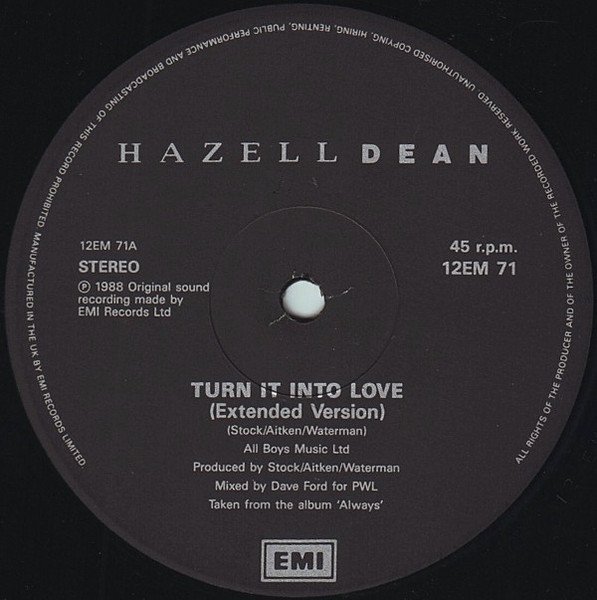 A, B1: Mixed for PWL All Boys Music Ltd. Taken from the album '[m=139582]' B2: Remixed for PWL Hazell Dean Music Ltd/Chelsea Music Publishing Co Ltd ℗ 1988 Original Sound Recordings Made by EMI Records Ltd © 1988 EMI Records Ltd Manufactured in the UK by EMI Records Limited