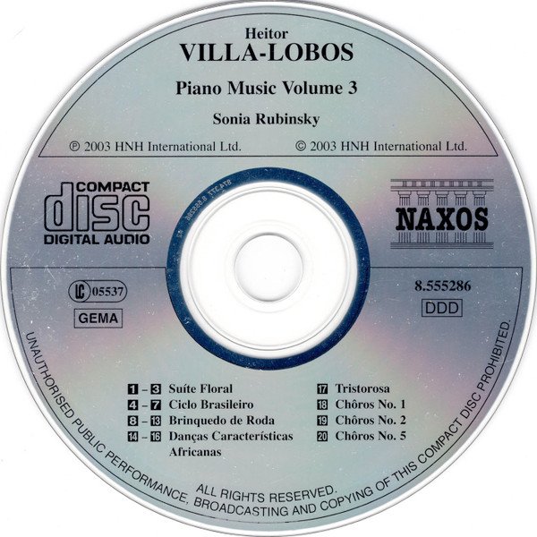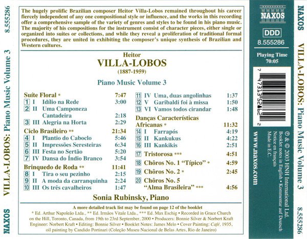 ℗ & © 2003. Made in E.C. Comes in a standard-size jewel case. 12pp stapled booklet has notes in English, German, & French. Playing time: 70:05. Recorded 19-23 September 2000 in Grace Church on the Hill, Toronto, Canada. Publishers by track: 1-3, 14-16, 18, 19 — Ed. Arthur Napoleão Ltda. 4-13 — Ed. Irmãos Vitale Ltda. 17, 20 — Ed. Max Eschig. Cover painting: “Café”,1935 oil painting by Candido Portinari (Coleção Museu Nacional de Belas, Rio de Janeiro)