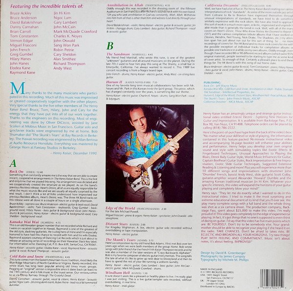Track A2 engineered at Audio Resource Honolulu. Track B5 engineered at Bay Records, Berkeley. Track A1, A3 to B2 & B7 engineered at Mobius Music, San Francisco. Mastered at Fantasy Studios, Berkeley. Made in England Distributed in Europe by Backs