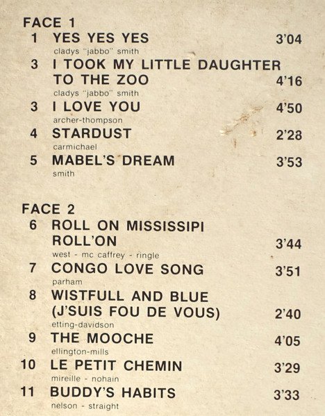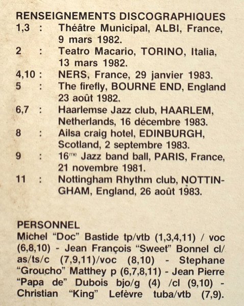 B1: "Roll On Mississippi Roll On" misspelt as "Roll On Mississipi Roll On". B3: "Wistful And Blue" misspelt as "Wistfull And Blue" Recorded at: A1, A3: Théâtre Municipal, Albi, France, 9 March 1982. A2: Teatro Macario, Torino, Italy, 13 March 1982. A4, B5: Ners, France, 29 January 1983. A5: The Firefly, Bourne End, England, 23 August 1982. B1, B2: Haarlemse Jazz Club, Haarlem, Netherlands, 16 December 1983. B3: Ailsa Craig Hotel, Edinburgh, Scotland, 2 September 1983. B4: 16me Jazz Band Ball, Paris, France, 21 November 1981. B6: Nottingham Rhythm Club, Nottingham, England, 26 August, 1983.