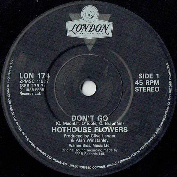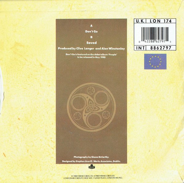 Don't Go is featured on the debut album '[m=133454]' to be released in May 1988. Designed by Stephen Averill-Works Associates, Dublin. ℗ 1988 FFRR Records Ltd. © 1988 FFRR Records Ltd. Original sound recording made by FFRR Records Ltd. Cat# LON 174 on back cover and labels. Cat# 8862797 on back cover. Cat# 886 279-7 on labels. See also: [r396611], silver label issue.