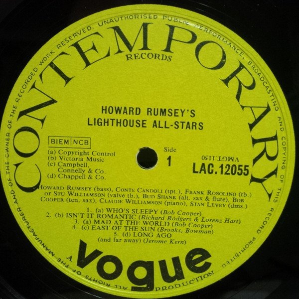 UK press. Recorded in Hollywood, December 3, 1954 (#A1,A3,B1), February 22, 1955 (#A5,B4), March 1, 1955 (#A2,A4,B2,B3). Copyright 1955 by Contemporary Records.