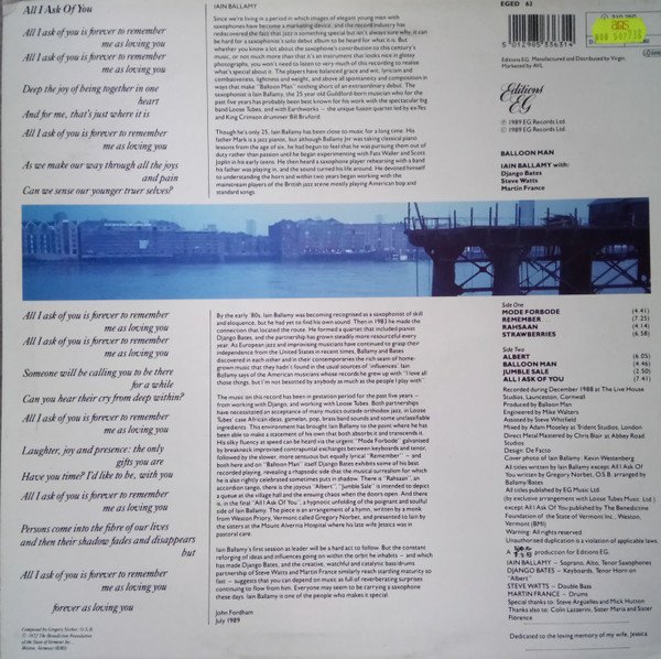 ℗ & © 1989 EG Records Ltd. Recorded during December 1988 at The Live House Studios, Launceston, Cornwall. Mixed at Trident Studios, London Produced by Balloon Man Liner Notes John Fordham, July 1989 Tracks numbered sequentially (1 to 8) On inner sleeve. - DRG Malago Britiss Patent No. 1125555 321 B 5/89 - Made in Great Britain. Track B4 (All I Ask Of You): - Composed by Gregory Norbet, O.S.B. / © 1972 The Benedictine Foundation of the State of Vermont Inc., Weston, Vermont (BMI) - Published by exclusive arrangement with Loose Tubes Music Ltd. - A Loose Tubes production for Editions EG