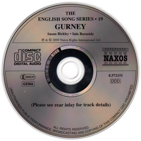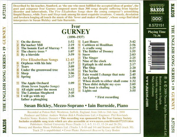 Playing time: 71:36 Tracks 3 and 4: First recording. Recorded at Potton Hall, Westelton, Suffolk, England, from 24th to 26th June, 2008. This recording was sponsored by the Ivor Gurney Society. Booklet notes in English. Made in Germany.