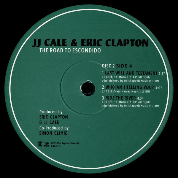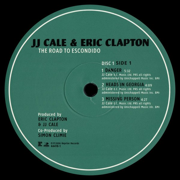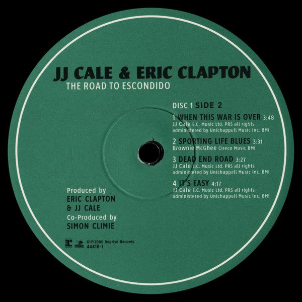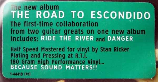 Plating and Pressing at R.T.I. 180 Gram High Performance Vinyl. Issued in gatefold sleeve made from thick cardboard with white inside. No inserts. Issued with hype sticker (catalog number 1-44418 (#1)): The new album The Road to Escondido The first-time collaboration from two guitar greats on one new album Includes: Ride the River and Danger Half Speed Mastered for vinyl by Stan Ricker Plating and Pressing at R.T.I. 180 Gram High Performance Vinyl... Because Sound Matters!! A 2014 reissue [r=5957750] is otherwise identical but has a slightly wider crop of the front cover image, and has "K1" on the hype sticker instead of "#1." Reprise Records and Duck Records logos appear on jacket back and labels. [a=Bushbranch], [a=The Rosebud Agency], Reprise Records and Duck Records logos appear in gatefold credits. Reprise only label on jacket spine. Made in U.S.A. © ℗ 2006 Reprise Records Album Mastered at Gateway Mastering Track publishers: A1 to B1, B3, B4, C3, D1, D3: E.C. Music Ltd. PRS all rights administered by Unichappell Music Inc. BMI B2: Cireco Music BMI C1: E.C. Music Ltd. PRS all rights administered by Unichappell Music Inc. BMI/Sony/ATV Tunes LLC/Specific Harm Music ASCAP B2: ©1974, Renewed 2002, Audigram Music, a div. of Evergreen Copyrights (admin. by ICG). B4: ©1978, Renewed 2002, Audigram Music, a div. of Evergreen Copyrights (admin. by ICG). D2: Crazy Mamas Music, LLC BMI [a=Dennis Caplinger] Courtesy of [l=Tricopolis Records] [a=Nathan East] Courtesy of [l=BMG]/[l=RCA Victor Records] [a=Albert Lee] Courtesy of [l=Sugar Hill Records] [a=John Mayer] Courtesy of [l=Aware]/[l=Columbia Records] [a=Billy Preston] Courtesy of Preston Music Group [a=Derek Trucks] Courtesy of Columbia/[l=Legacy] Recordings In Memory of Billy Preston & Brian Roylance