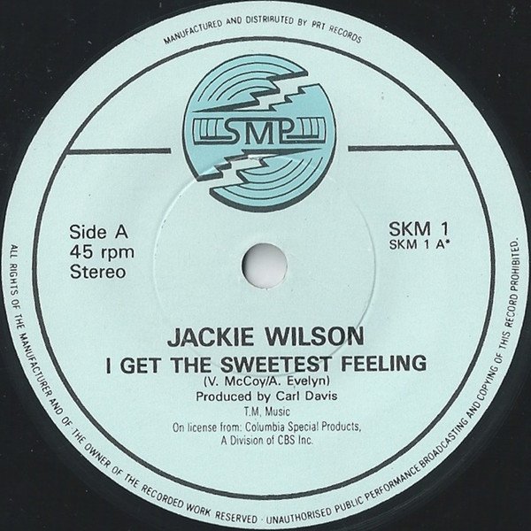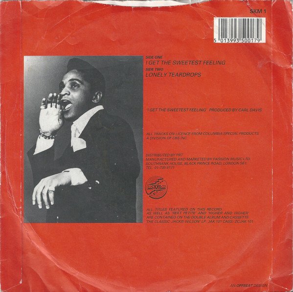 Back cover: All tracks on licence from Columbia Special Products a division of CBS Inc. Manufactured and marketed by Passion Music Ltd. All titles featured on this record as well as 'Reet Petite' and 'Higher And Higher' are contained on the double album and cassette 'The Classic Jackie Wilson' LP: JAK 101 cass: ZCJAK 101. An Offbeat design. Labels: Manufactured and distributed by PRT Records. On license from: Columbia Special Products, a division of CBS Inc. A: T.M. Music B: Jewel Music Publishing Co. Ltd.