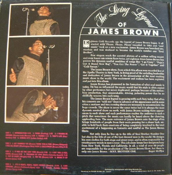 Track A4 is a speech of thanks to the audience by James Brown. Track B1 to B3 is played as a continuous track by James Brown and his band and is listed on the record as lasting 14:54. Live performance includes The Flames and Maceo Parker.